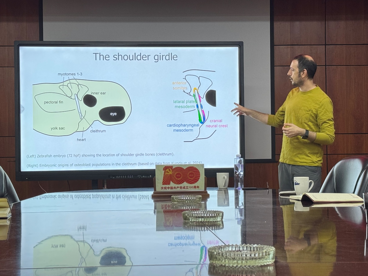 2025年12月23日上午,我中心邀请曲靖师范学院客座教授普拉门·安德烈耶夫 (Plamen Andreev)作了以“骨骼之前的棘刺(Spines before bones)”为主题的学术报告。恐龙演化中心主任陈军、地学院史骁副教授等我校古生物学专业教师及研究生们参加了学术报告交流会。会议由中心主任吴文昊主持。