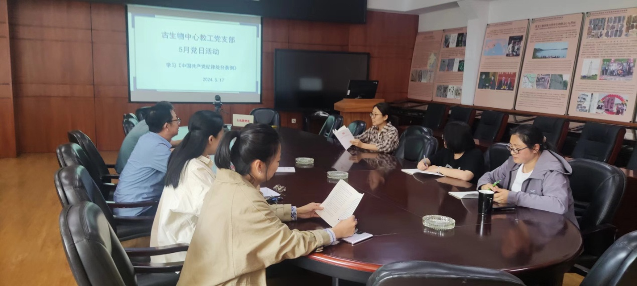 按照学院党委党纪学习教育工作部署,结合党纪学习教育工作计划,古生物中心教工党支部于5月17日在古生物楼三楼会议室开展了5月党日活动,集中学习《中国共产党纪律处分条例》第一篇总则。党支部书记于洋主持会议,全体支部党员参加会议。