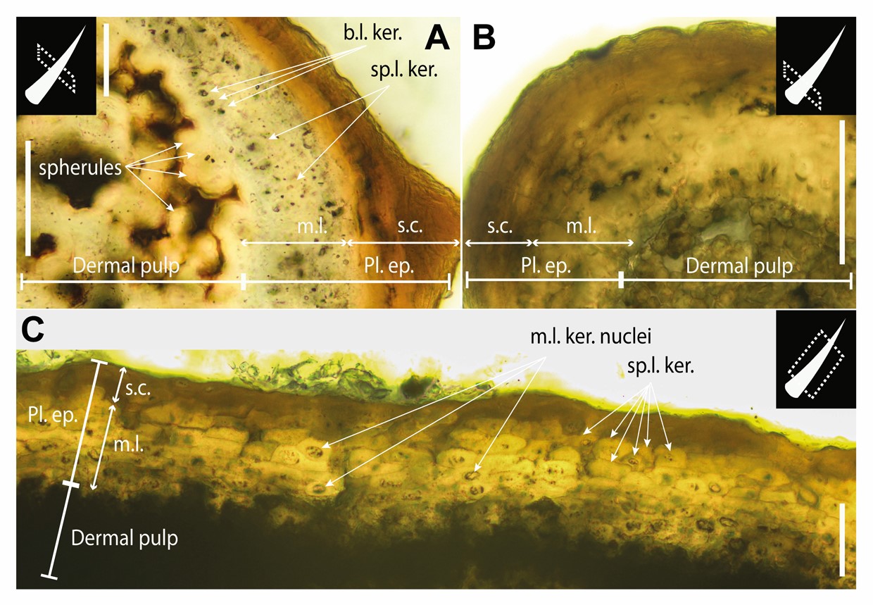 更令人惊叹的是,通过化石切片的组织学分析,团队首次在皮肤刺状衍生物中观察到完整的细胞层级结构--外层为角质化表皮,中层保留多层上皮细胞及椭圆形细胞核,中心为疏松的真皮髓质。这一保存状态在非鸟恐龙中属全球首例。